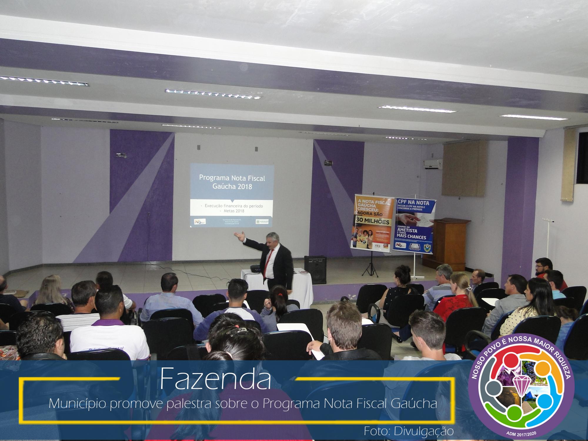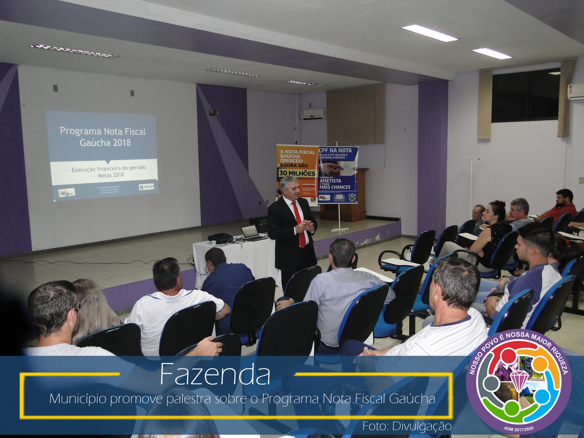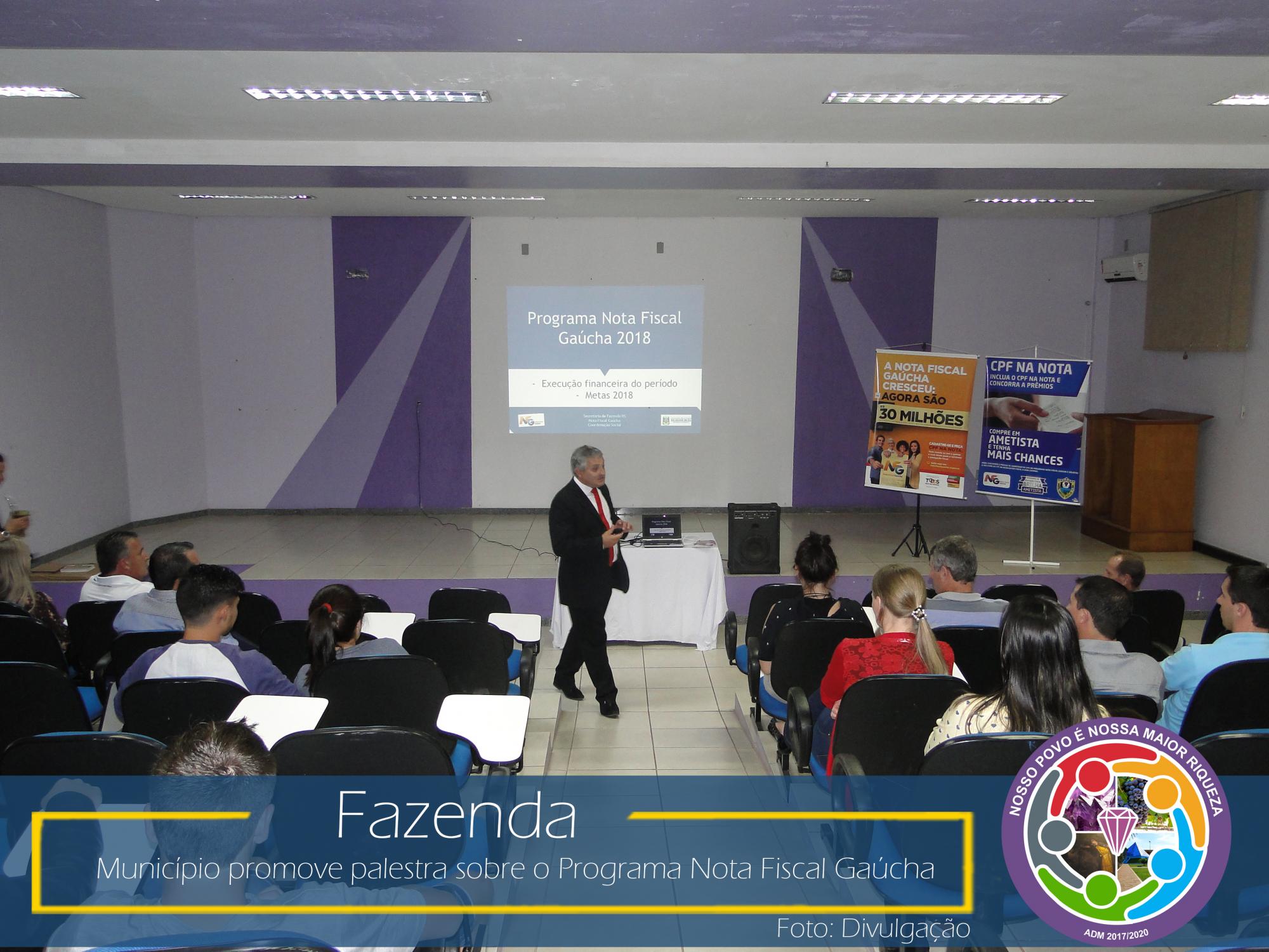 Com esse intuito, na última sexta-feira, dia 23 de março de 2018, no Auditório da Prefeitura Municipal, aconteceu uma palestra com o coordenador da área social da NFG, Adelar Vendruscolo, que abordou temas relevantes como: ICMS e sua forma de rateio entre os municípios, Programa Nota Fiscal Gaúcha e seu funcionamento: cadastro, sorteios municipais e estaduais, valores sorteados, valores repassados as entidades cadastradas no município, entre outros.
